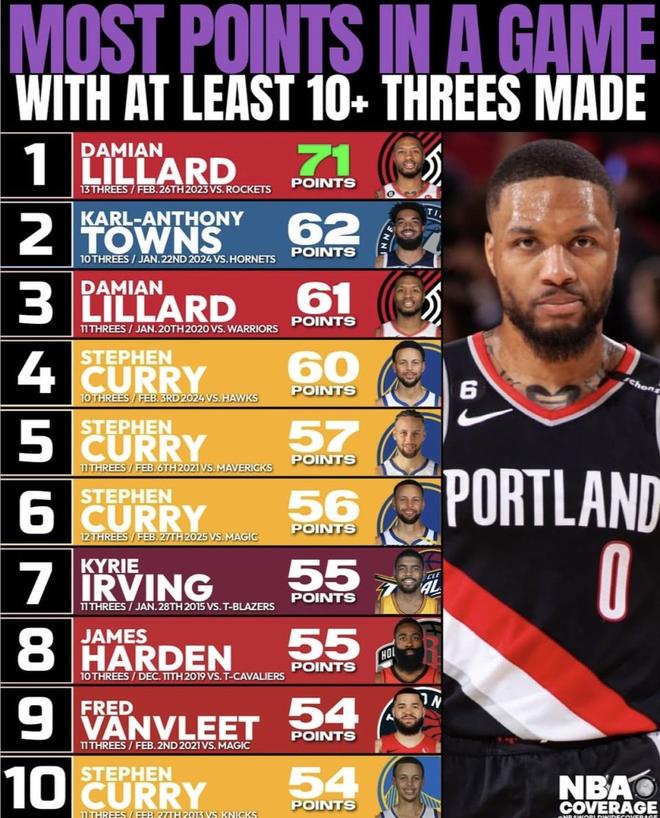 近日,NBA Coverage发布了“单场至少命中10记三分的最高得分”榜单——利拉德以71分领跑,唐斯62分紧随其后,库里四度上榜(含2025年对魔术的12记三分)。下方按对手、比分、年龄、三分命中等要素逐条列出,便于读者快速核对与对比(数据截至2025年10月17日)